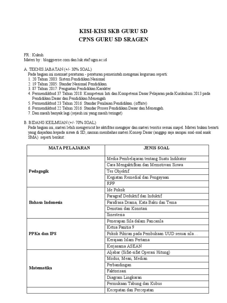 Pembelajaran bersifat dinamis, hal itu dikarenakan hubungan timbal balik antara guru dengan peserta didik dan peserta didik dengan. Tahap skb merupakan tahapan yang harus dilewati para pelamar cpns yang sudah lulus tahap skd.materi skb mencangkup bidang yang telah dikuasai atau sesuai dengan kualifikasi pendidikan yang dipilih saat awal pendaftaran. C selengkapnya 100 soal latihan seleksi kompetensi bidang (skb) tes cpns 2018 untuk guru sd yang sudah disertai dengan kunci jawabanya dapat didownload melalui link berikut ini: Ini adalh soal skb guru pendidikan pgsd atau guru sd yang sudah lolos pada tahap skd, pada soal ini anda bisa belajar lengkap dan ada juga pemabhasannya di l. Soal dan jawaban riviu pembelajaran pembelajaran 3: Soal skb seleksi kompetensi bidang guru sd mi (pgsd pgmi) seleksi cpns 2020/2021 akan terkait dengan standar kompetensi guru. Misalkan jika anda jurusan pgsd maka tes skb (seleksi kompetensi bidang) anda tentang pendidikan. Jumlah soal 200 57 materi farmasi klik disini. Geometri untuk calon guru p3k pgsd tahun 2021 kami bahasa di bawah ini. Soal pppk 2021 skb pgsd ppkn pedagogik tahun 2021.berikut ini adalah beragam soal dan pembahasannya. Selanjutnya seleksi cpns 2019 akan dialnjutkan pada tahap tes skb yang akan direncanakan dimulai pada tanggal 25 maret 2020. Download ringkasan (rangkuman) materi skb guru kelas sd (pgsd) cpns pdf: Modul guru belajar untuk guru sd mandiri ini sebagai fasilitasi calon pendaftar guru asn p3k berupa modul berisi materi sebagai tambahan bekal untuk mengikuti seleksi guru asn pppk.